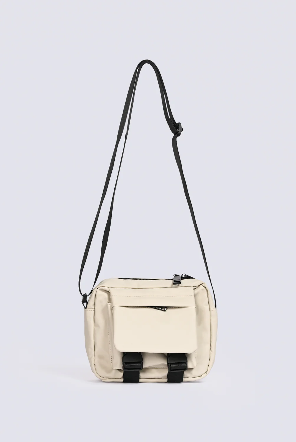 A beige crossbody bag with black accents and front buckles, designed with multiple zipper pockets and an adjustable strap.