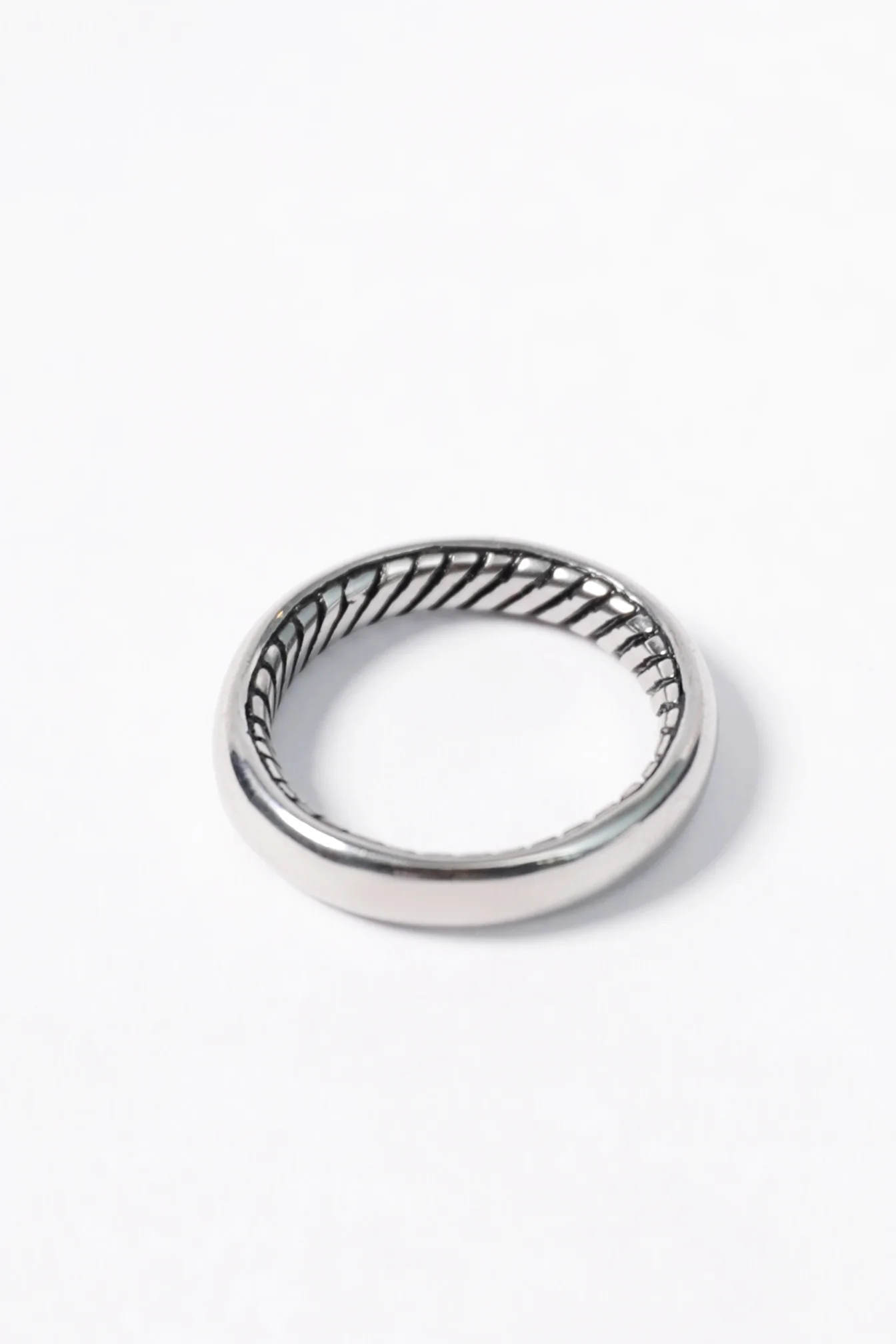 Silver band with a sleek, polished exterior and a hidden inner pattern for a touch of subtle intrigue.
